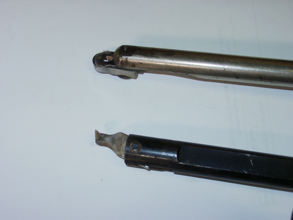 I use these next two shown below regularly to hog out major wood in the bottom of a bowl. It's especially useful in highly irregular natural edged and very large bowls where a catch can be extremely dangerous to my health. The force of the tool is translated into a torque instead of a straight push on the handle, so deep catches just rotate the bit away from the wood. This results in some very tired forearms, however the bent one on the left is pretty handy if you lower the tool handle down a foot or more and sort of hook the tool over the tool rest. I use the set screw on the end of the tool as a hook or "gate" which many woodturners now use to prevent lateral motion on the tool rest.